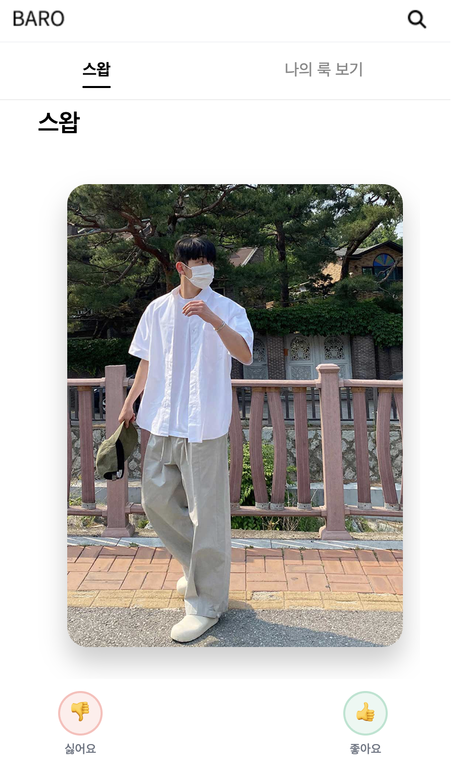 핵심기능으로는 사용자가 가장 본능적이고 빠르게 호불호를 판단하는 인터페이스인 ‘스와이프’에 주목했다. 틴더가 사람을 만나는 행위를 직관적인 제스처로 바꿨듯, 옷을 고르는 행위를 스와이프로 진행한다면 비교적 가볍고 편하게 코디를 볼 수 있을 것이다. '바로' 서비스에서 구현한 스왑 페이지는 아래와 같다