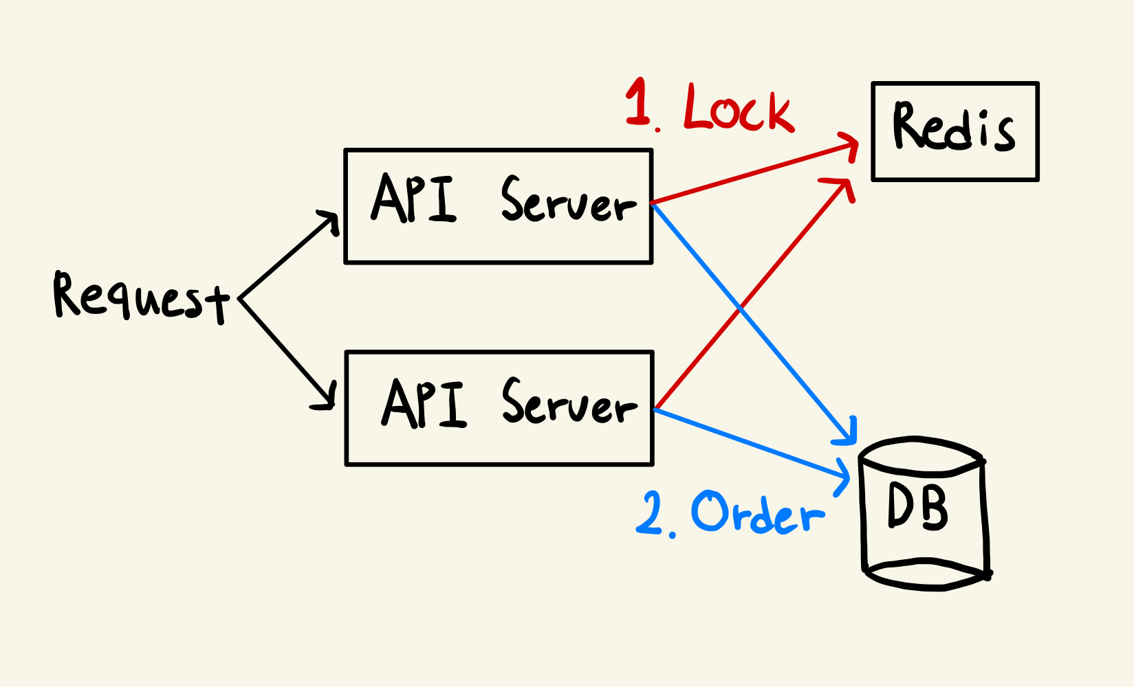 먼저 분산락을 적용했다고 가정하고 구조를 다음과 같이 생각해 볼 수 있다. 먼저 애플리케이션 서버에서 Redis를 통해 Lock을 획득한 후, Lock을 보유한 상태에서 DB에 데이터를 저장하고, 작업 완료 후 Lock을 해제하는 방식이다.