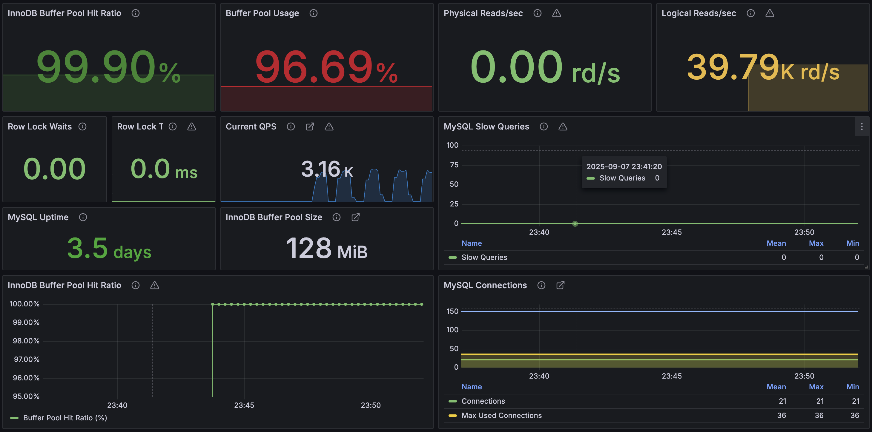 TPS, 응답시간 모두 처참했다.. DB가 병목이었을 것이었기에 Grafana를 통해 MySQL까지 모니터링하였다