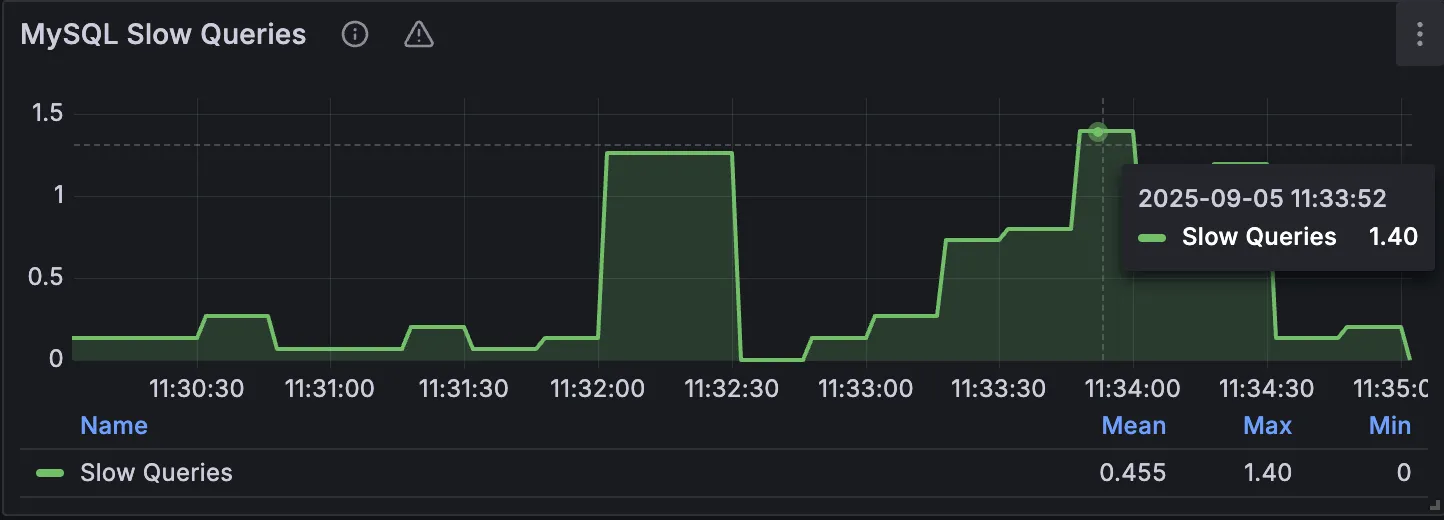 이처럼 Slow Query가 발생했던 것을 확인할 수 있다. 기존에 Slow Query 측정 기준을 1s로 설정을 해두었고, 카운트가 집계되는 것으로 보아 1s가 넘는 쿼리들이 발생하고 있다는 뜻이다. 그럼 이제부터 어떤 쿼리가 문제였는지 찾아보자