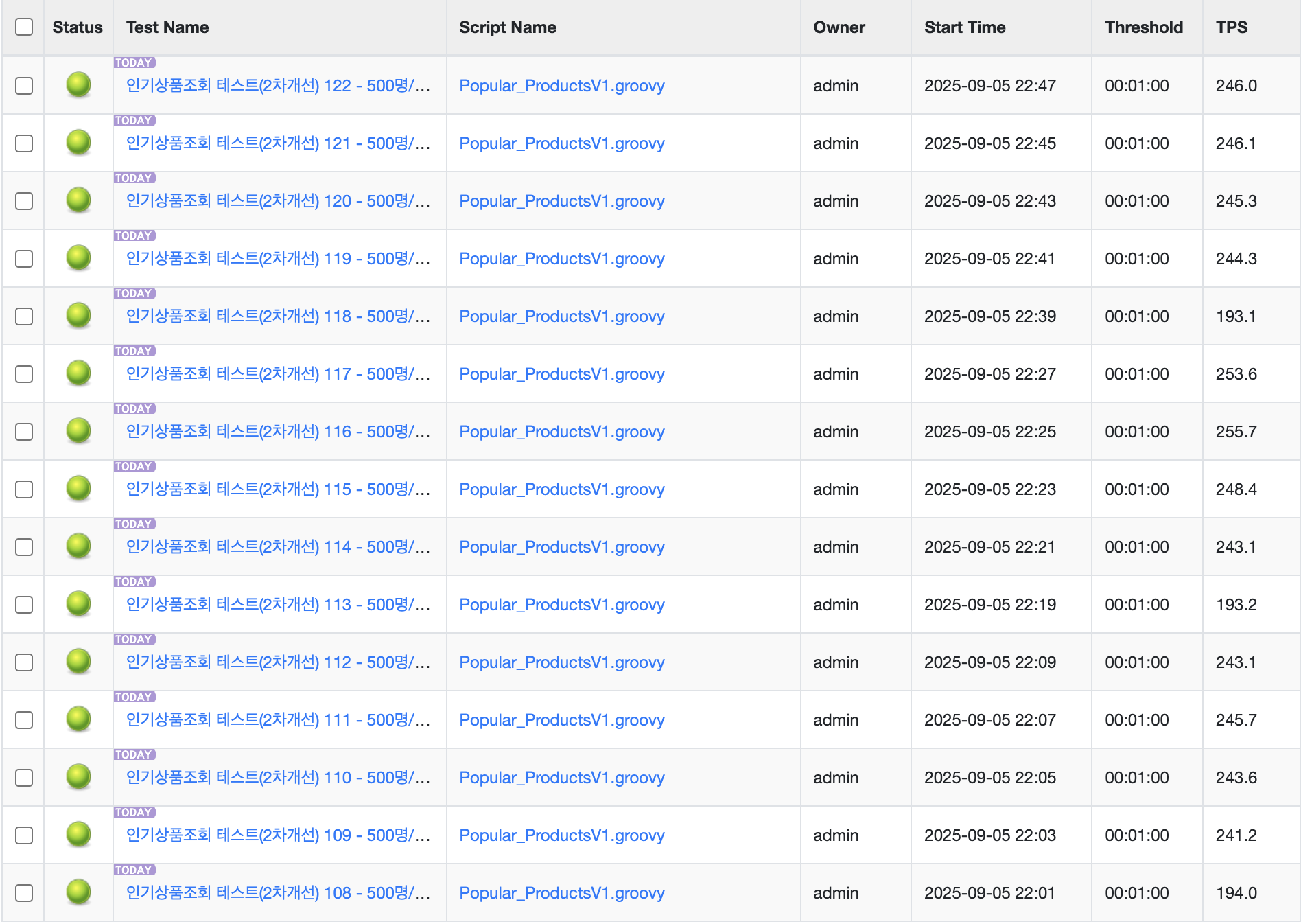 이전 테스트까지는 Cursor가 없는 첫 페이지 조회만을 대상으로 했기 때문에, 현재 결과는 훨씬 더 향상 된 TPS를 보여주고 있다. Cursor가 없는 첫 페이지의 경우 WHERE 조건 절에서 필터링이 적용되지 않아 조회 대상 데이터가 많이지고, 이로 인해 성능이 저하되었다. 따라서 Cursor가 있는 두번째 페이지부터는 성능이 개선되기 때문에, 사용자 접근 빈도가 높을 것으로 예상되는 첫 페이지만 Redis를 통해 사전 캐싱해두면 전체적인 성능을 크게 향상시킬 수 있을 것이다.