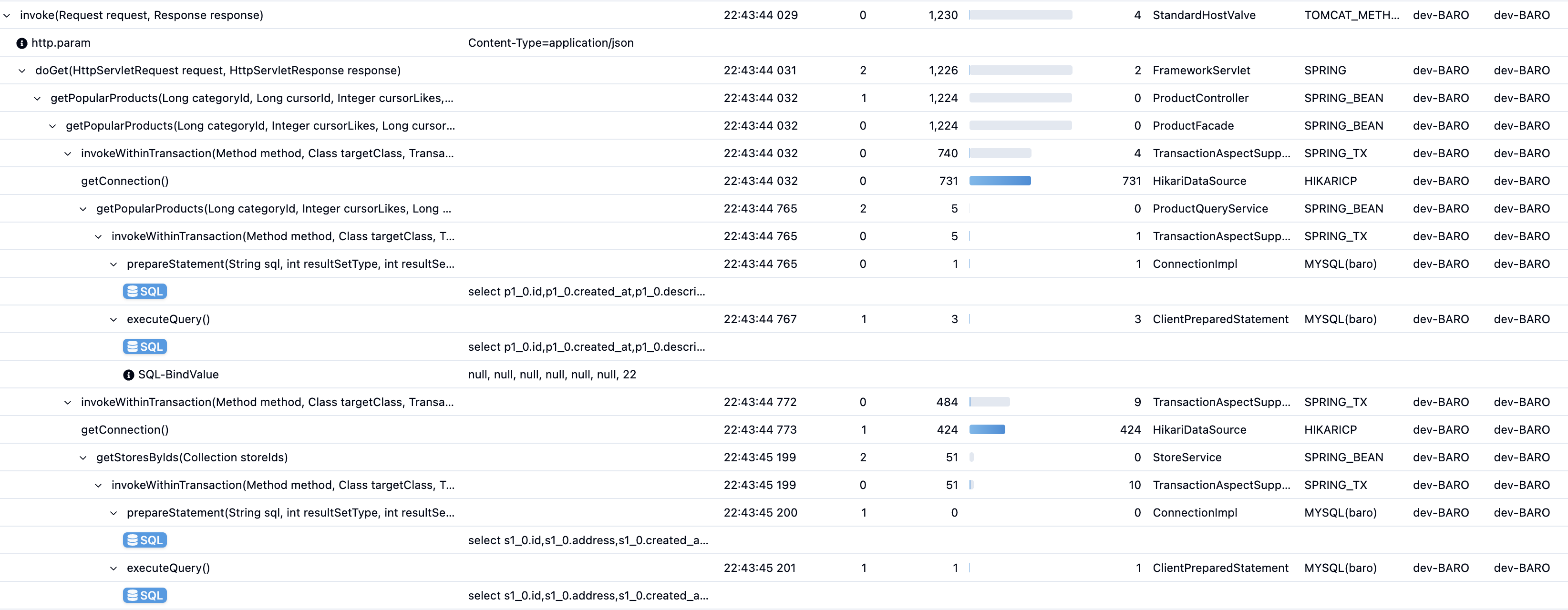 현재 Products(상품) 테이블에는 180만개의 데이터가 적재되어있다. 180만개였던 이유는 무신사의 경우 1만개 브랜드가 입점해있었고 '바로'에서는 그의 5분의 1 수준인 2000개 브랜드 기준으로 브랜드당 3개의 카테고리, 카테고리 당 300개의 상품을 둔다고 가정한 수치이다. 기능 개발을 마치고 API들을 테스트해보던 중 인기상품조회 API의 응답시간이 느리다는 것을 파악하게 되어 개선을 시작했다